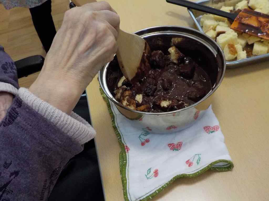 普段はミキサー食を食べている方ですが、チョコレートを砕いたり、カステラを細かく切るなど、一通りの工程を「できない~」と言いながらも、バッチリ上手にしてくださいました。