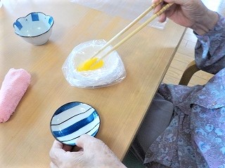 今回も「計る」「混ぜる」「すくう」「潰す」「こねる」「ほぐす」「被せる」 「挟む」「切る」「縛る」「すくう」「広げる」 などの様々な作業をご利用者様主体にて行って頂きました。
