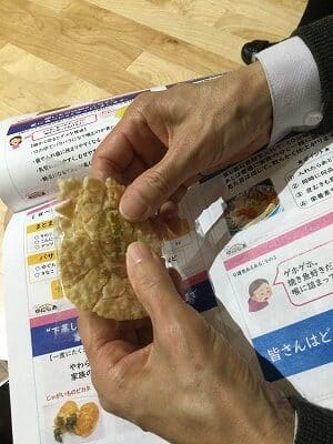 訪問看護ステーションさんの紹介のあと、「噛みにくい」「飲み込みにくい」などのように、食事の食べにくさを感じるようになったとき、おうちで無理なく出来ることについて、食べ物や飲み物を実際に口にしていただきながら「飲み込めない」「食べにくい」体験を通じてご紹介させていただきました。
