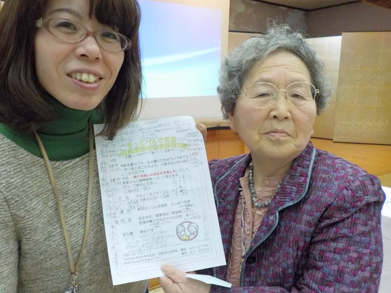 平成27年2月12日(木)に東根さくらんぼ温泉にて開催された、東根市地域包括支援センターさん主催の介護予防講座「もっとげんき教室」にて、講師を担当させていただきました。