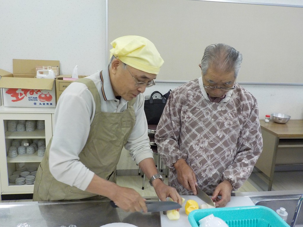 男性だけのグループでは、日ごろから台所を手伝ったりしているという方は慣れた手つきで果物のカットを手際よくされていました。奥さんは「させてるからね~」とちょっと得意げ(笑)