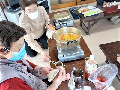 普段使わないというカット野菜や缶詰に皆さん興味深々! ただ開けて入れる便利アイテムを駆使して 炊飯器とカセットコンロだけであっという間に2品が完成しました。