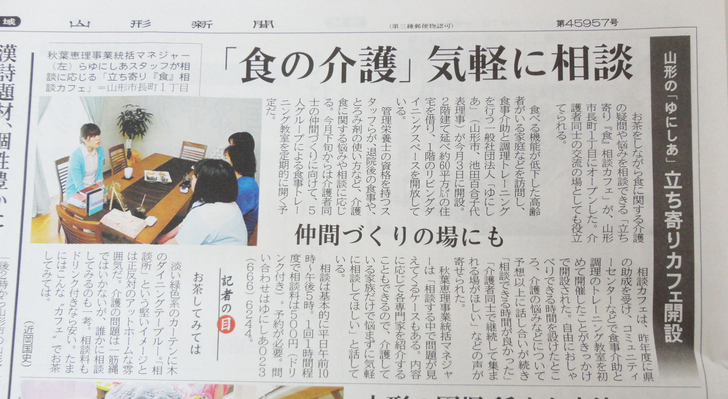 平成25年6月7日(金)の山形新聞さんで、6月よりオープンした相談所【立ち寄り食相談カフェ】をご紹介いただいております。