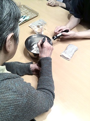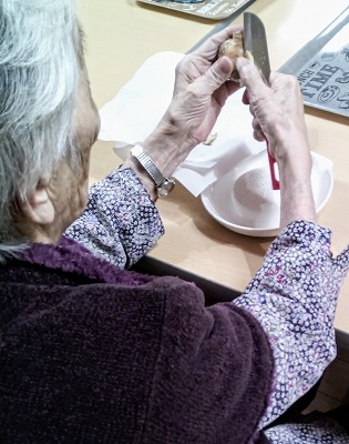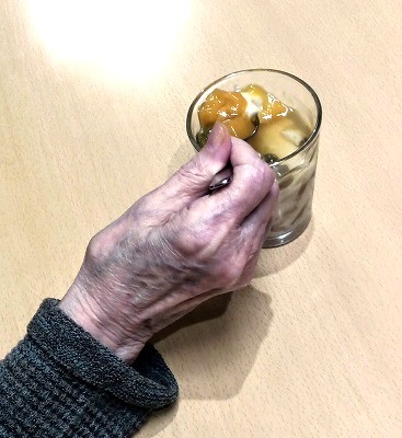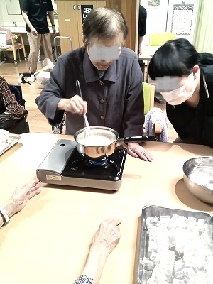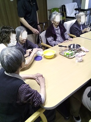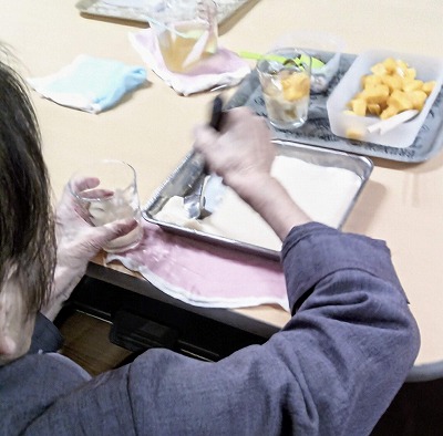 猛暑が収まるもまだまだ9月とは思えない気温が続くこの日 ひんや~りと冷たいアジアの香り漂うおやつに挑戦頂きました! 今回も「計る」「切る」「ねじる」「混ぜる」「すくう」 「開く」「移す」「おろす」「絞る」「浸す」「かける」「注ぐ」 などの様々な作業をご利用者様主体にて行って頂きました。