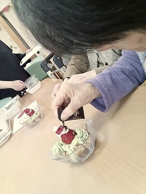 ● (サンタいちごの顔をみて)じゃべりだしそうだ~ ● 好きなものばっかり♪ ● 抹茶がいい味~ ● 来年もたのしみにしてます! など・・・ いちごを手に持ったまま包丁でヘタを取る器用さを発見したり 普段見れないご利用者様のチカラが毎回みられる貴重な機会だと 職員さまより嬉しい感想を頂きました♪ 来年もどうぞよろしくお願いします!
