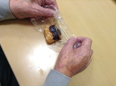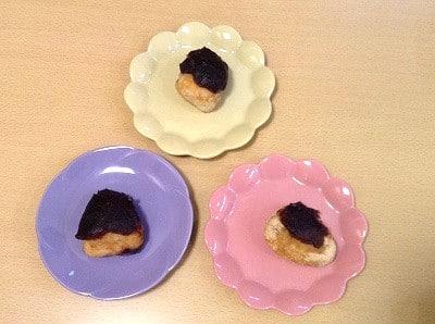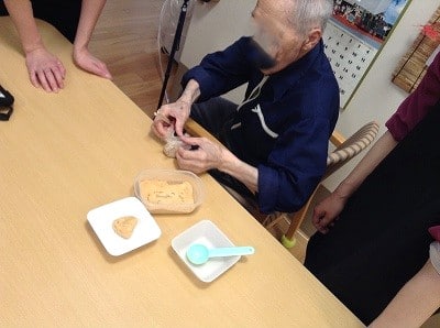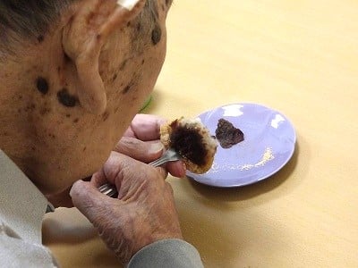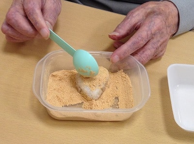 先日ご施設でもおはぎを提供し、大好評だったとのこと。今回はご飯に長いもを混ぜた軟らかいおもちをベースに栗の形を象り、きなこやあんこでトッピングをしていただきました。