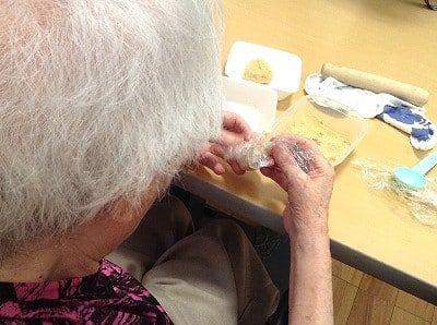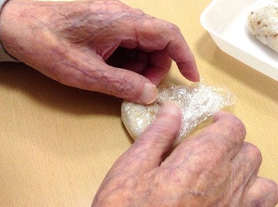 今回も「計る」「切る」「潰す」「こねる」「伸ばす」「握る」「まぶす」「包む」「はがす」「置く」などの様々な作業をご利用者様主体にて行って頂きました。