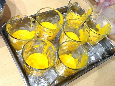 はじめは熱々に蒸し上がったかぼちゃの皮むきからスタート!包丁を器用に使い、りんごの皮むきのように実がほとんど皮に付かない薄さできれいに剥いてくださいました。ビニール袋に入れて熱いうちにめん棒や手で滑らかになるまで潰します。牛乳を加えてベースが出来たら火にかけ寒天がに溶けるようにしっかりと加熱します。器に流して目の前で冷えるのを待ちます。固まるのを待つ間もみかんの缶詰と余った皮の千切りを使い、かぼちゃをイメージしてデコレーションの準備です。