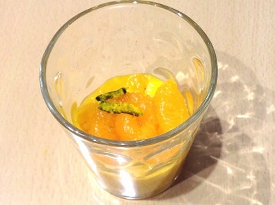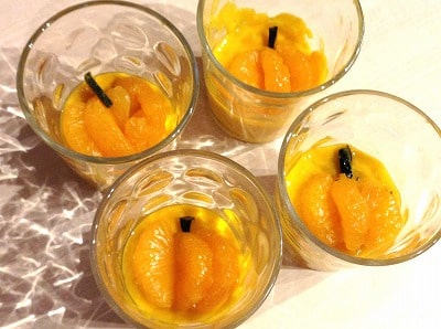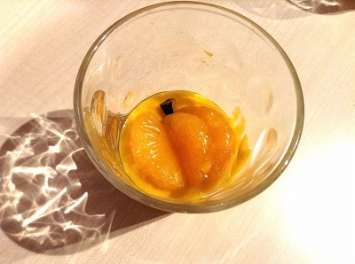 固まったかぼちゃプリンの上にみかんとかぼちゃの皮の千切りをのせたら、かぼちゃを象ったみかんがのったかぼちゃプリンが完成です!