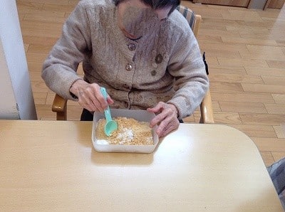 表面にまぶすきなこを用意する作業では、担当になって下さった方がきなこ大好きさんだったようで、とても喜んでして下さいました。砂糖ときなこ、少量の塩を混ぜ合わせる時は、こぼさないようにとても丁寧に作業をしてくださいました。