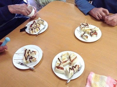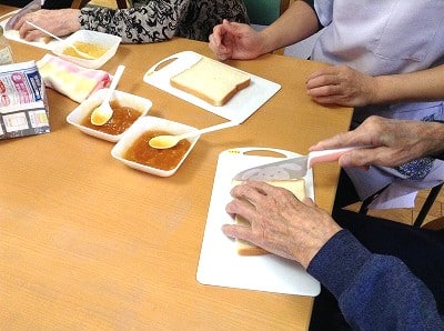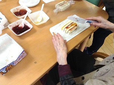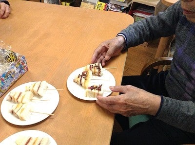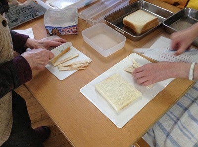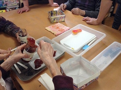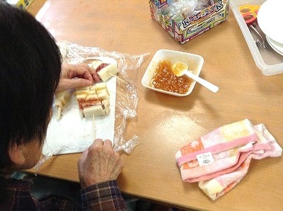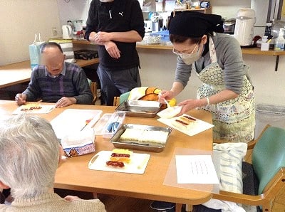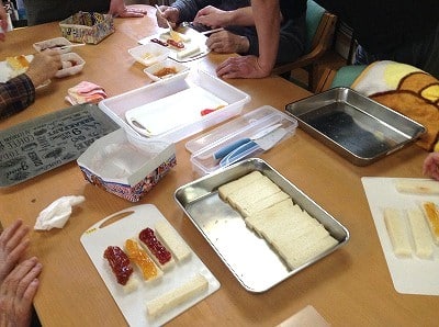 今回も「切る」「塗る」「重ねる」「包む」「切る」「刺す」「垂らす」「ふりかける」などの様々な作業をご利用者様主体にて行って頂きました。