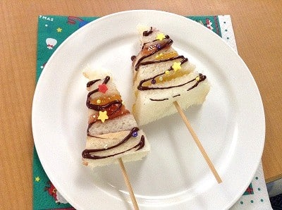 ラップに包んで落ち着かせたら、いよいよ仕上げ!ツリーに見立てて三角に切る作業は潰れないように慎重に。思い思いに包丁を入れて様々な大きさや形の三角形を切り出していきます。お皿に盛り付けて串を刺し、溶かしたチョコレートやチョコスプレーでデコレーションをしたら、私だけのクリスマスツリーが完成しました!