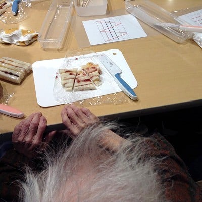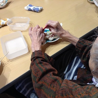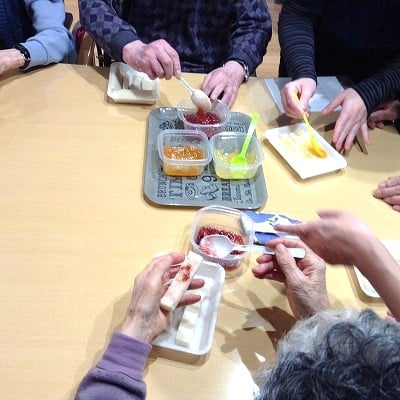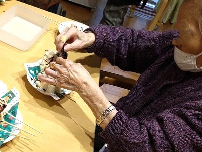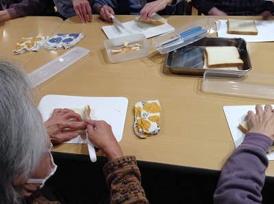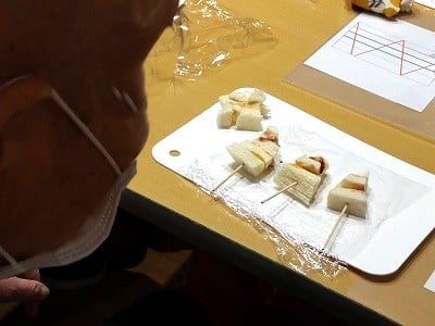今回も「切る」「分ける」「塗る」「重ねる」「包む」「切る」「刺す」「垂らす」「ふりかける」などの様々な作業をご利用者様主体にて行って頂きました。