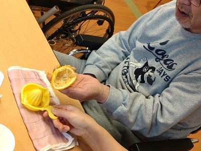 柚子の皮をすり押ししてもらうと、リビング一帯に「柚子の香」が立ち込めて、柚子の香りをかいでもらいましたら「冬の匂い」「すごい柚子!!」「あ~いい香り!柚子だ!」と喜んでおられました。片麻痺でもとても丁寧に皮をすり下ろして下さいました。果汁を絞る際も、皮がなく滑る状態になっていましたが、丁寧に絞ってくださいました。「手がもう柚子だらけ!」「すごい柚子の匂いする」と手に移った柚子の香りににっこり。