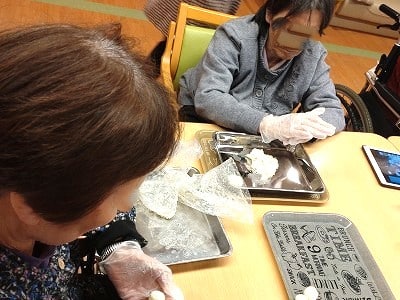 今回も「切る」「計る」「絞る」「揉む」「混ぜる」「こねる」「落とす」「すくう」「注ぐ」「浮かべる」などの様々な作業をご利用者様主体にて行っていただきました。