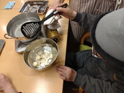 最近、「だんご木」を作ったそうで、こねて丸める作業も早い早い!茹でる時も最初はおっかなびっくりな所はありましたが、沸騰した湯に入れて浮きあがってくると、上手にすくって水に取ってくださいました。