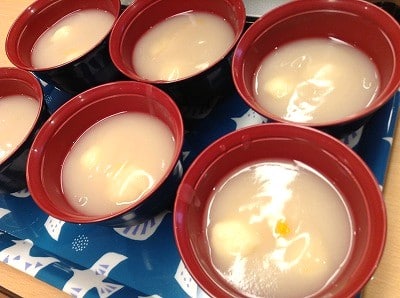 白あんが珍しく、皆さん「あんこ」が大好きという事でしたので「白あんのお汁粉」をとても楽しみに作っていました。白あんを伸ばす時も、相談してどのくらいの餡の濃度加減にするか迷っているようでしたが、相談の結果、「しゃばしゃばしないで、すこしトロッとした感じ!」で決定し、水加減を調整して理想の「おしるこ」に仕上げて下さいました。