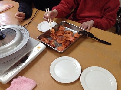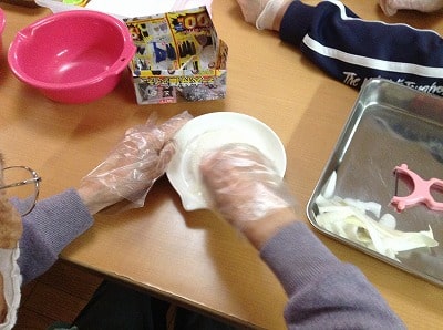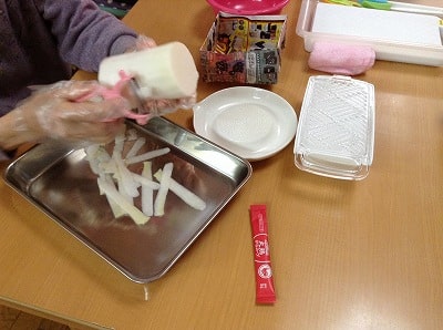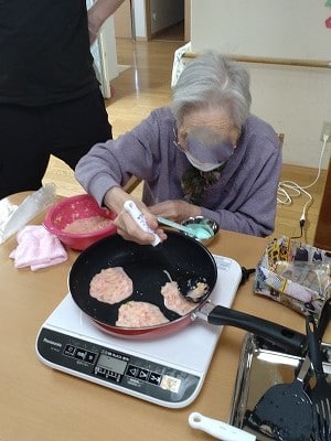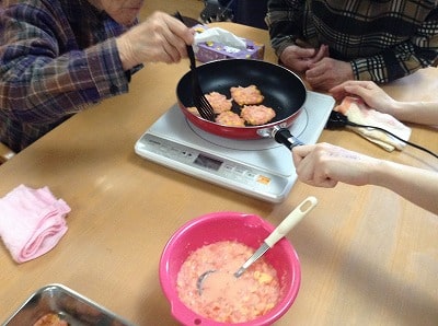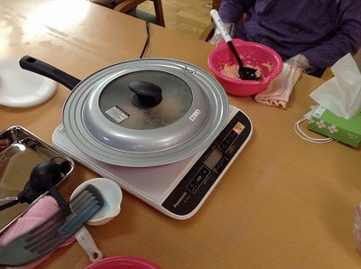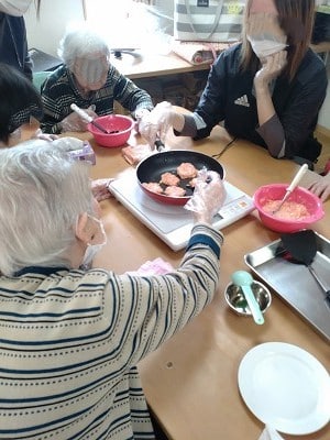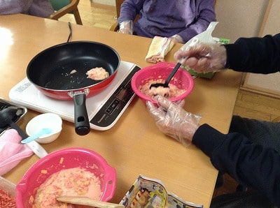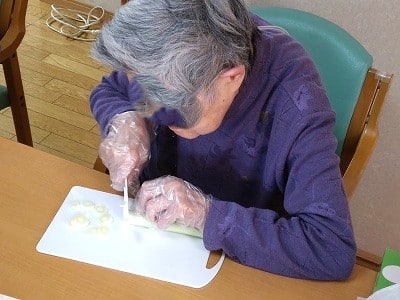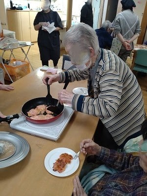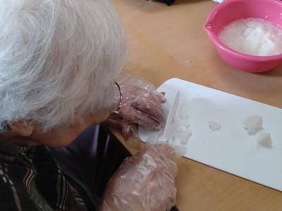 今回も「切る」「剥く」「すりおろす」「はかる」「混ぜる」「ちぎる」「流す」「裏返す」「開く」などの様々な作業をご利用者様主体にて行って頂きました。