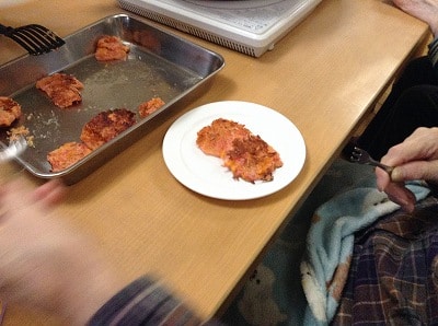 出来上がった生地をフライパンで焼き上げていきます。大根おろしがどうなるのか皆さんどきどきの様子でしたが、焼きあがってくると海老の香ばしい香りが漂い食べるのが待ち遠しい様子が伝わってきました。