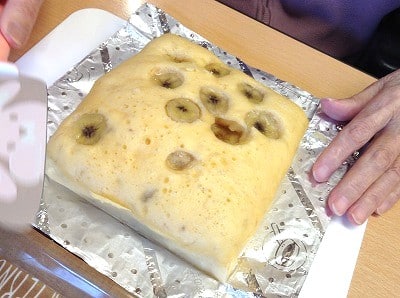 今回はホワイトデーにちなんでピンクのマーブルにするかどうか迷い皆さんにご意見を伺ったところ、「白で!」としっかりとご意見を出してくださり、シンプルな仕上がりにすることが決定!生地には潰したバナナも加え、フライパンでじっくりと焼いていきます。