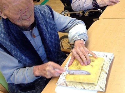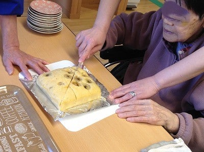 15分じっくり焼いて完成!いよいよ仕上げのカットとなったとき、崩れないかな~と心配していましたが、担当してくださったご利用者さまは「男だもの!この位の熱さは問題ない!大丈夫!大丈夫!」と頼れる言葉をくださり、安心してお任せ出来ました!お言葉の通り、きれいに等分してくださいました。