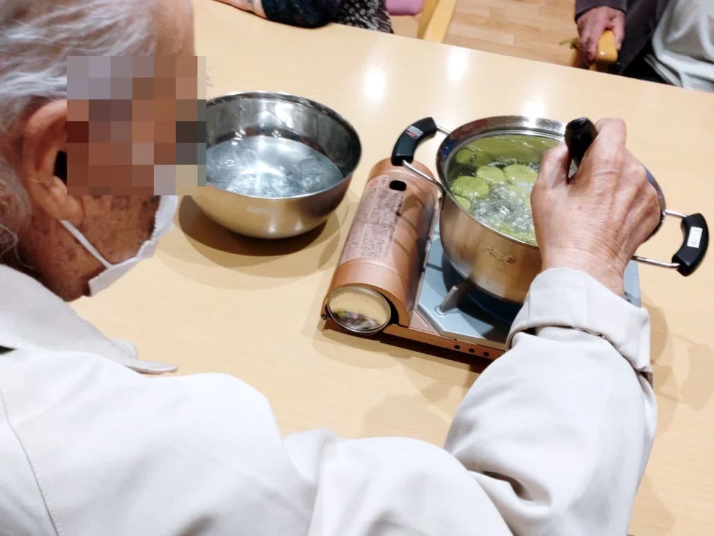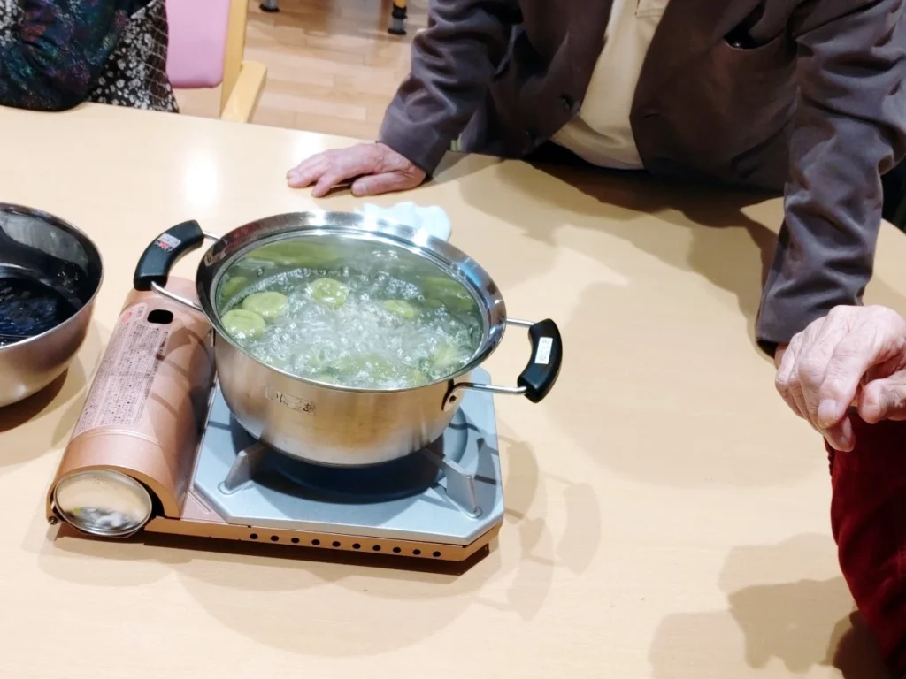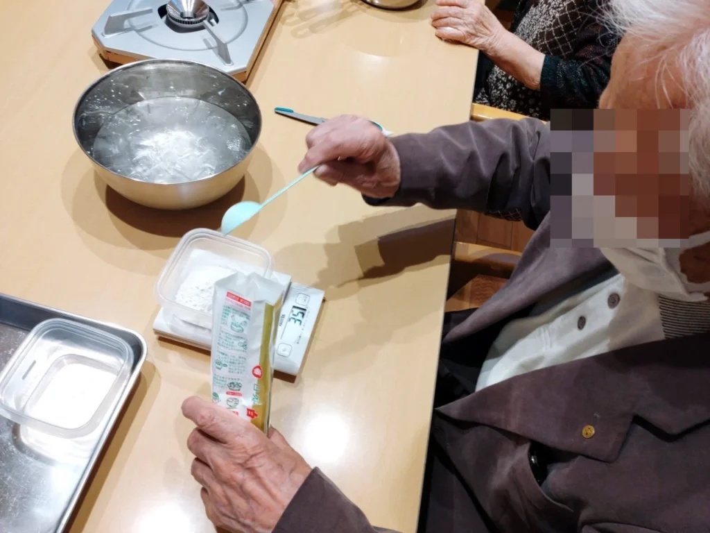 今回も「計る」「はがす」「切る」「揉む」「混ぜる」「丸める」「落とす」「すくう」「注ぐ」などの様々な作業をご利用者様主体にて行って頂きました。