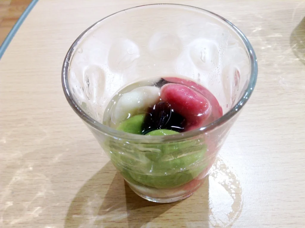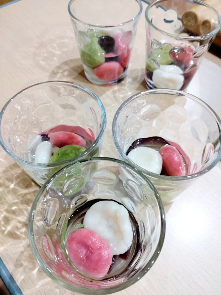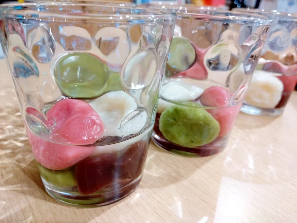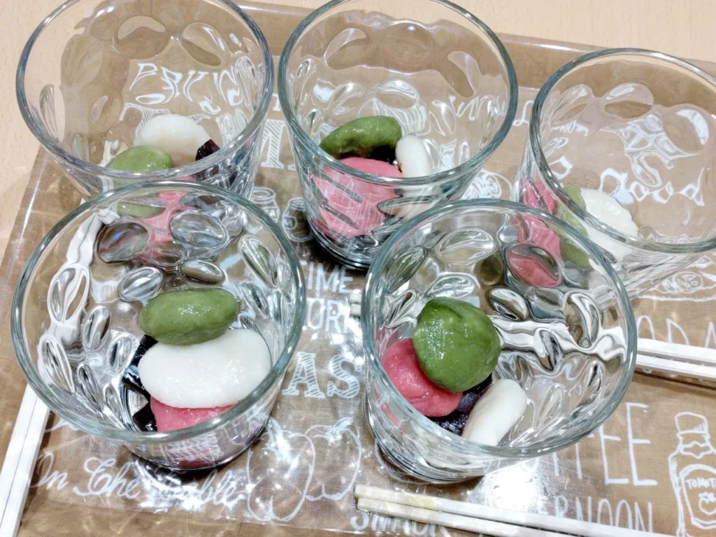 苦労の末に出来上がった3色の白玉だんごに角切りした羊羹をトッピングし、白みつを注いだら完成です!見た目が華やかな素敵な逸品ができました♪