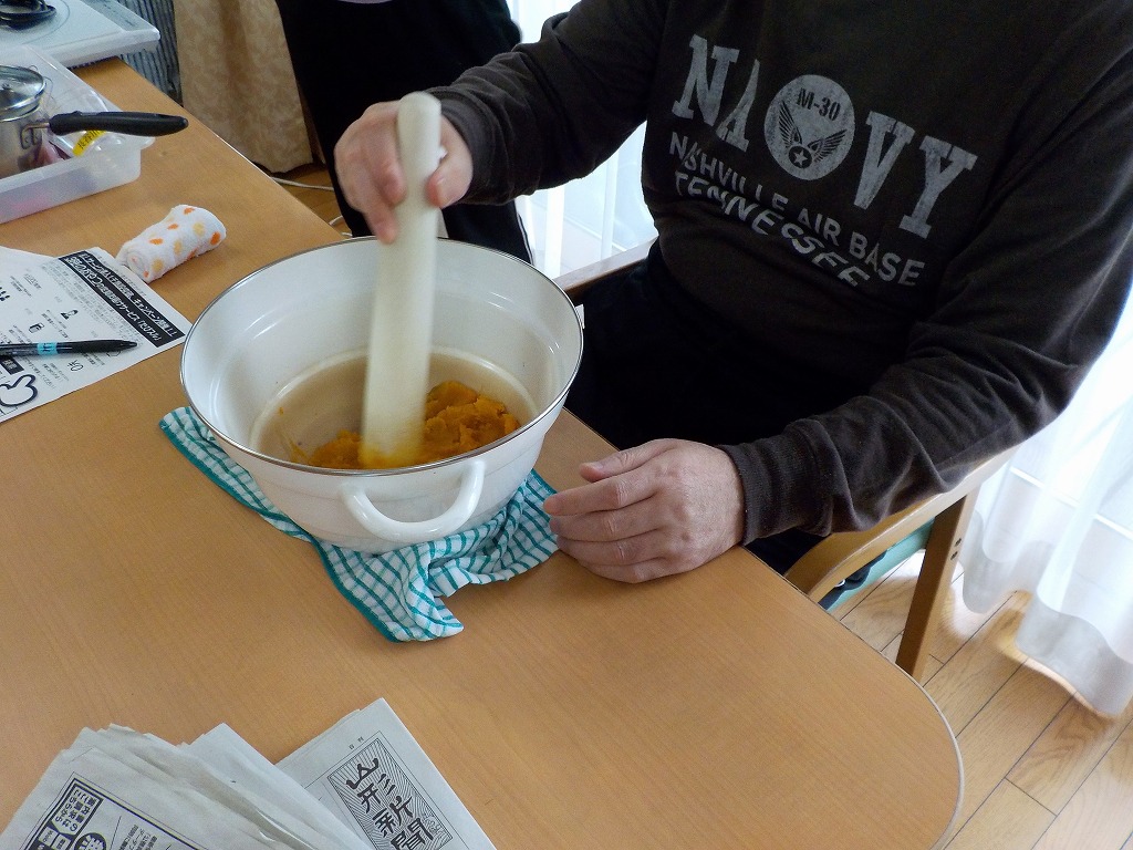 蒸し立てアツアツのかぼちゃをすり棒で潰します。