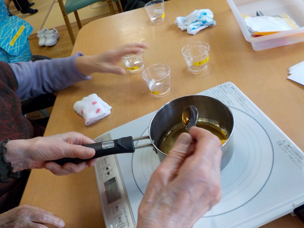 目が見えにくい方や手が動かしにくい方はビニールに入れて、握るように潰していただきました。