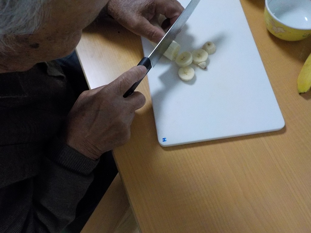 ○ 始めて包丁を使うところを見たご利用者さまもいました。こだわりを持って包丁でバナナの皮をむかれたのが印象的でした。