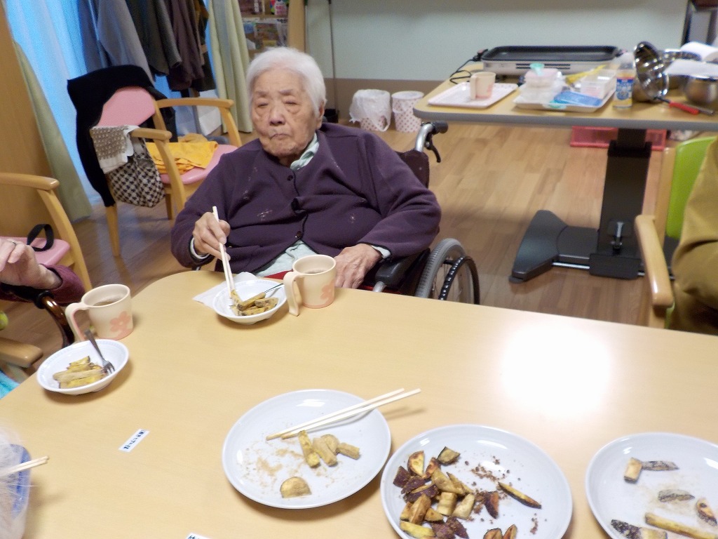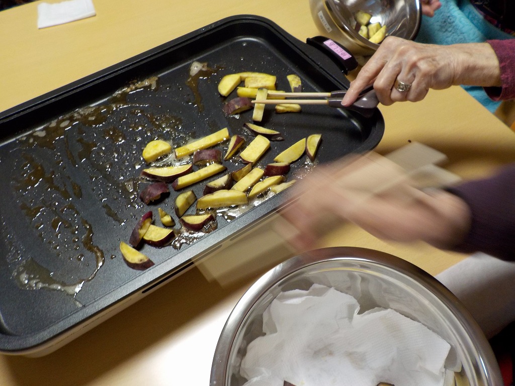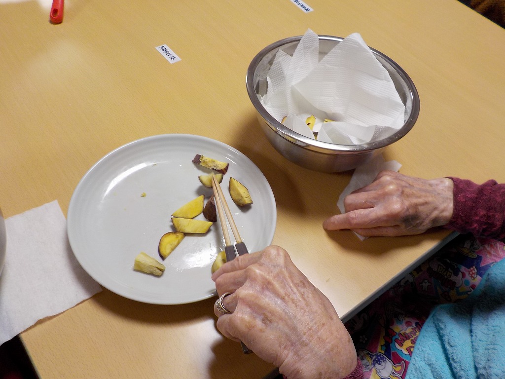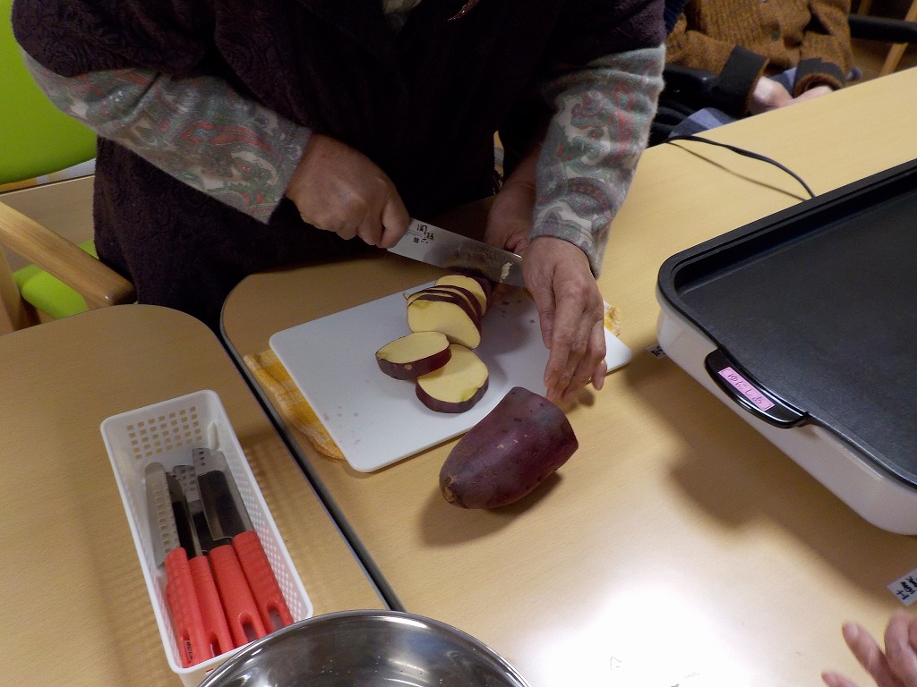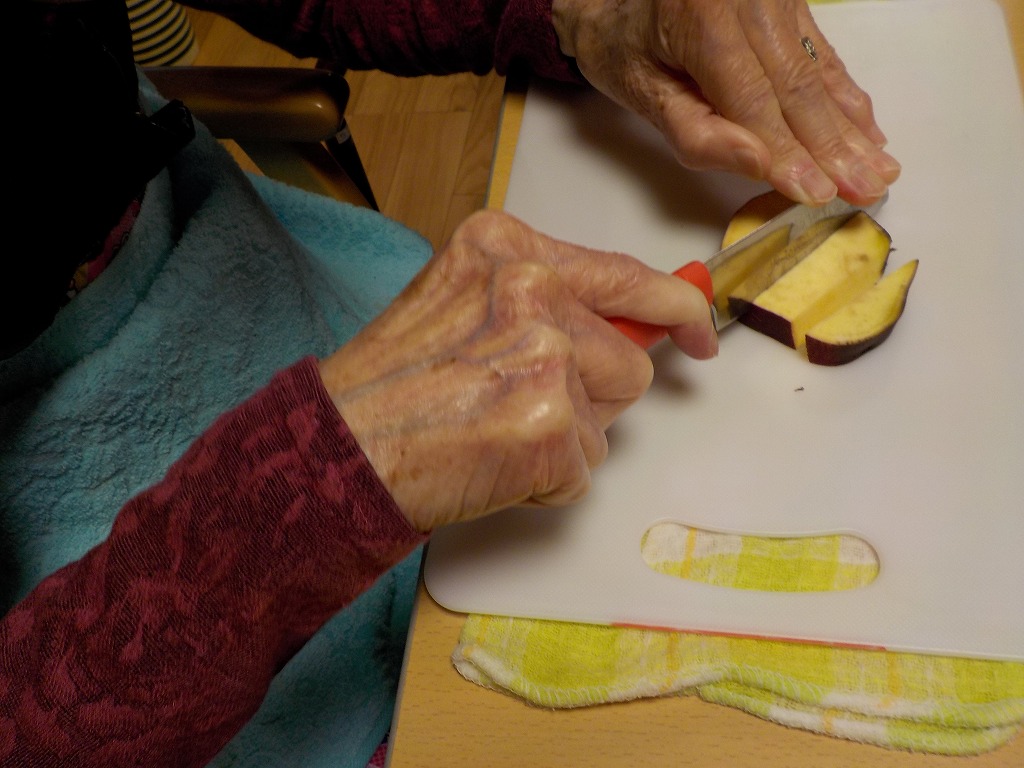 まるまると大きいさつまいもは切るのに力が必要ですが、道具の選択や下処理などの工夫で怪我のリスクを軽減しながらも、ご利用さままでで切って頂きました。手に麻痺がある方も周りの応援を受けながら、ゆっくりとでも確実に包丁に力を入れ、上手に切って頂けました!