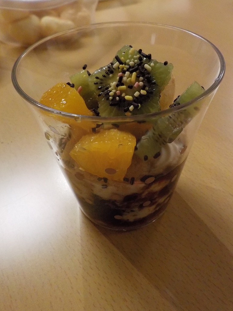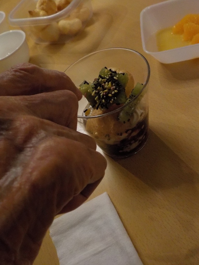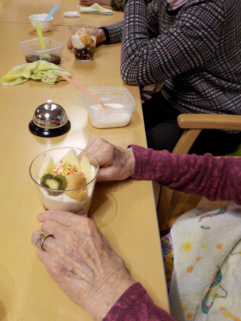 今回はご利用者さまの誕生日会を兼ねての開催とのことで、旬のくだものをたっぷり使って自分だけのケーキ風にサンデーを作って頂きました。