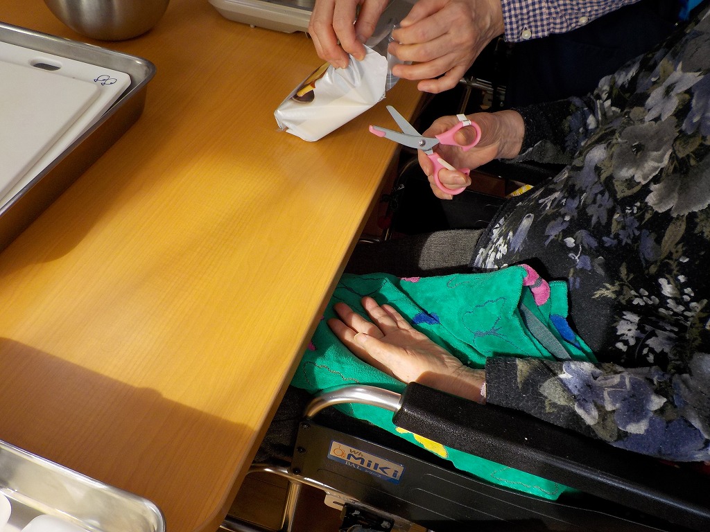 いつもだと計量したり、混ぜたりと下準備は職員さんで!となりがちですが、ゆにしあの食リハは準備からももちろんご利用者様主体です。