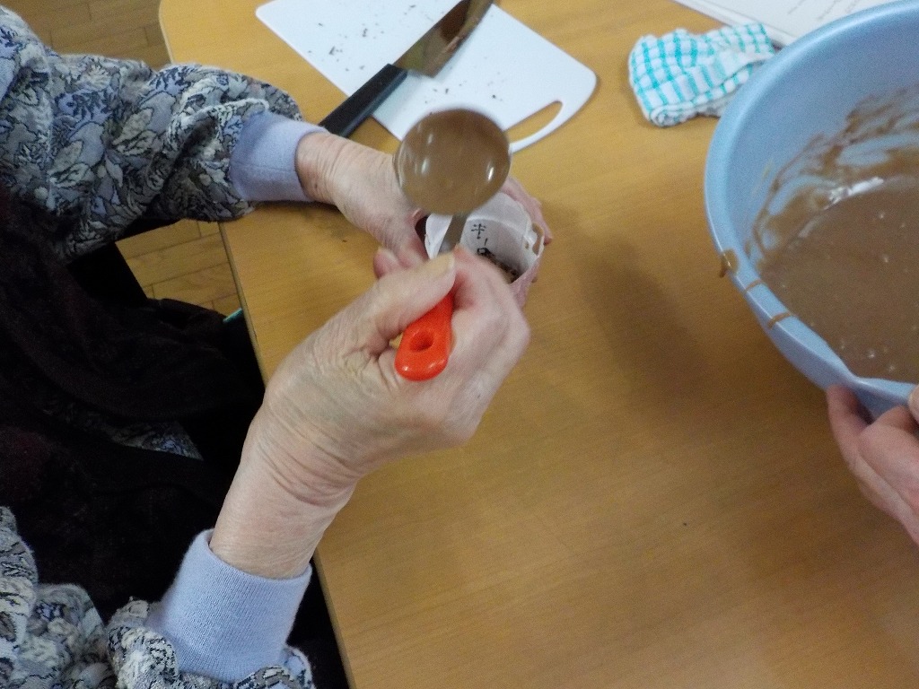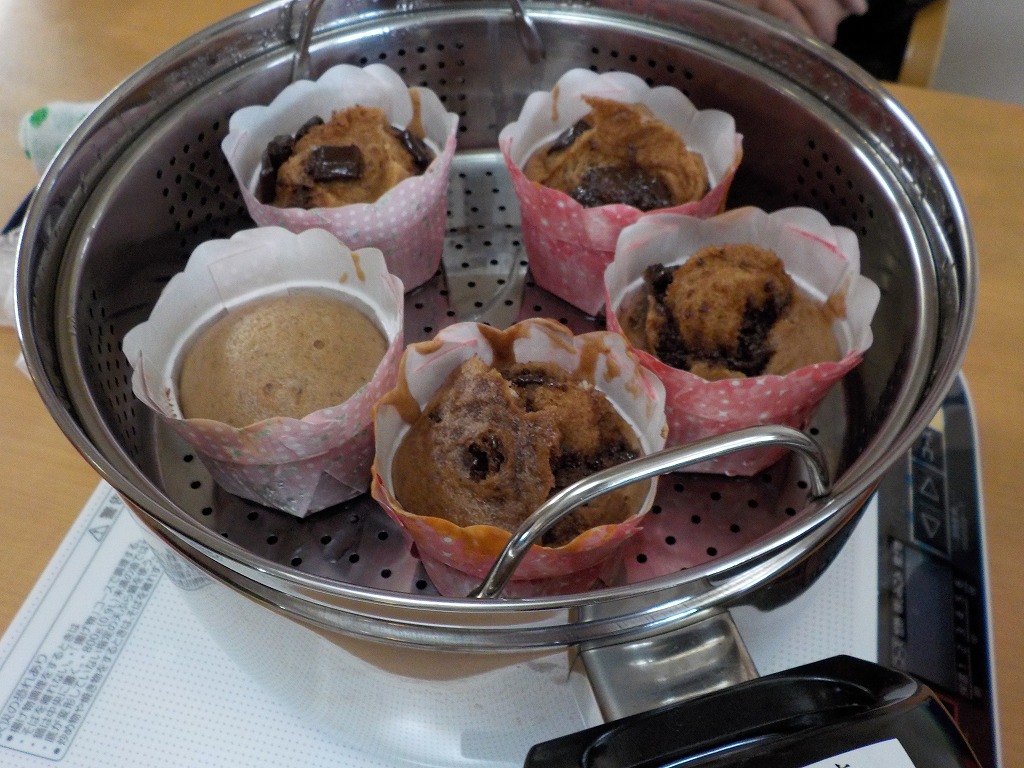 今回も「計る」「卵を割る」「混ぜる」「開封する」「割る」「砕く」「刻む」「流す」「記名」「時間を計る」「蒸す」「かける」などの沢山の作業をご利用者さま主体で行っていただきました。