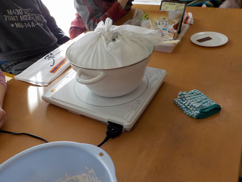 固い生クリームのパック開封も泡立てで皆さん全員で協力して行って頂きました。