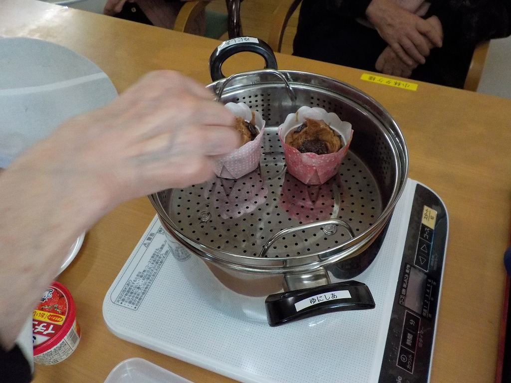 ついつい職員さんがやってしまいがちな蒸し器に置く作業も、安全面に注意しながらご利用者さまにしていただきました。