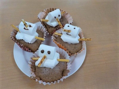 毎日どっさり雪が降り積もる今にぴったりの冬を感じる可愛いお菓子です。 今回も「開封する」「計る」「混ぜる」「流す」「刺す」 「のせる」「ふるう」 などの様々な作業を ご利用者様主体にて行って頂きました。