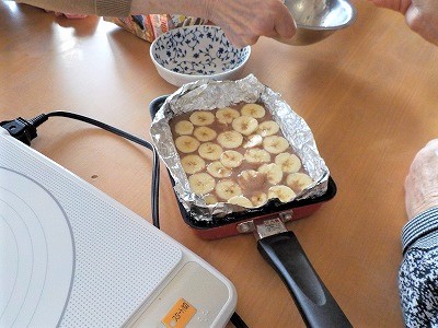 生地作りからスタート。 開封、計量、割卵はお手の物! 3グループともどんどん作業が進んでいきます。 トッピング用のスライスバナナと生地に練り込む潰しバナナも スタンバイOK! 粒を指で感じながら丁寧に潰してくださいました。