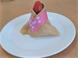 桃の節句にちなんだ春らしい和菓子です。 今回も「開封する」「計る」「混ぜる」「流す」「のばす」「裏返す」 「絞る」「折る」「切る」「包む」「のせる」「転がす」「巻く」 などの様々な作業をご利用者様主体にて行って頂きました。 硬い牛乳パックの開封作業、細かな苺のヘタ取り作業、割卵など たくさんある下ごしらえも分担しながらどんどん進みます。 包丁さばきは流石!長年のご経験が光ります!