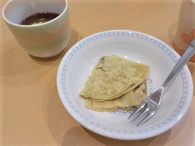 包む作業でも皮が破れたり あんがはみ出すこともなく キレイに成形くださいました。 きなこをまんべんなくまぶしたら完成です! ミキサー食の方もご自分の軟らか八つ橋風の盛り付けをしてくださいました。