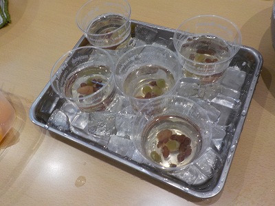 30℃を超える暑いこの日にぴったりのひんやりデザートです。 今回も「計る」「混ぜる」「流す」「つぶす」「移す」「分ける」 「のせる」「流す」などの様々な作業を ご利用者様主体にて行って頂きました。