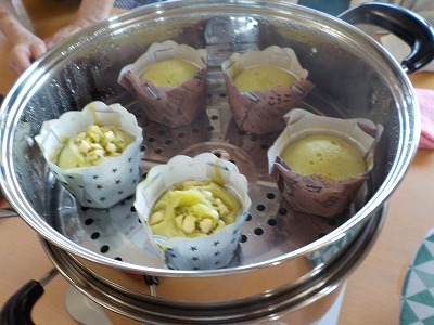 生地が出来たら、各自で好みに合わせて型に流し入れます。 ホワイトチョコは底、真ん中、上に・・・ 大きなまま、細かく砕いて・・・など とそれぞれ思い思いに。 目の前に置かれた蒸し器に入れて蒸し上がりを待ちます。 腕時計をされている方はご自分の時計でチェック!