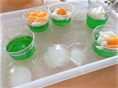 メロンソーダゼリーが固まったら プルプルのクリームジュレをかけて メロンをのせたら完成です! 小さくカットしたメロンを散らしたり フワフワのミルクジュレをキレイに敷き詰めたり こんもり盛り付けたりと それぞれ思い思いに盛り付けて頂きました。