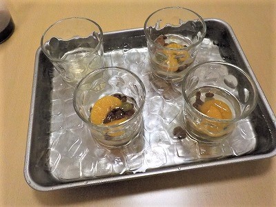 梅寒天液を沸騰させたらグラスに注ぎ 氷水を張ったバットに沈めて固まるのを待ちます。 半分程固まったらお湯に浸して軟らかく仕上げた甘納豆と 色鮮やかな国産みかん缶を飾ります。