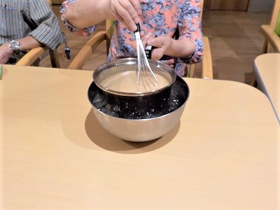 暑さが落ち着いたお盆過ぎにぴったりの しっぽり大人のデザートです。 今回も「開封する」「計る」「混ぜる」「注ぐ」 「分ける」「潰す」「かける」「振る」など 様々な作業をご利用者様主体にて行って頂きました。