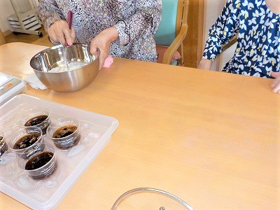 ジメジメした蒸し暑さを吹き飛ばす 冷たいさっぱりデザートです。 今回も「開封する」「計る」「混ぜる」「注ぐ」 「分ける」「剥く」「切る」「のせる」など 様々な作業をご利用者様主体にて行って頂きました。