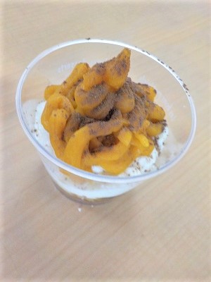 盛り付けはそれぞれご自分の手で。 カステラを敷き詰めてコーヒー液をしみこませ 豆腐クリームを流したら 潰したかぼちゃを絞り出し ココアパウダーをかけて完成です! お好きな量だけお好みの方法で盛り付けます。 かぼちゃペーストを絞り出す表情は真剣そのもの。 自分だけのこだわりの逸品が出来ました!