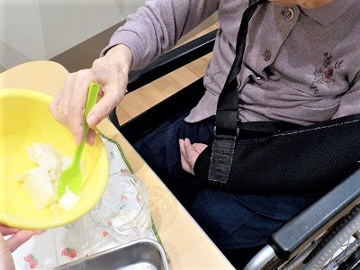 普段はミキサー食やムース食を召し上がっているご利用者さまも 持ち方の工夫をしながら 分担作業やご自分が食べる分の盛り付けを意欲的にしてくださいました。