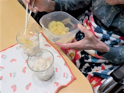 始めてのデザート作りに「何するか分からない・・・」と初めは不安そうでしたが 一度目の前で作業をお見せすると 直ぐに手に取り手際よく切ったり・・・混ぜたり・・・ 「栗好きですか?」の問いにも 「栗好き~」と皆さん元気に答えてくださいました。 洋梨は山形が誇るラ・フランスです! たくさんの食材が盛り付けられ 「これも入れるの!?」とご利用者さまもびっくりのボリュームとなりました(笑)
